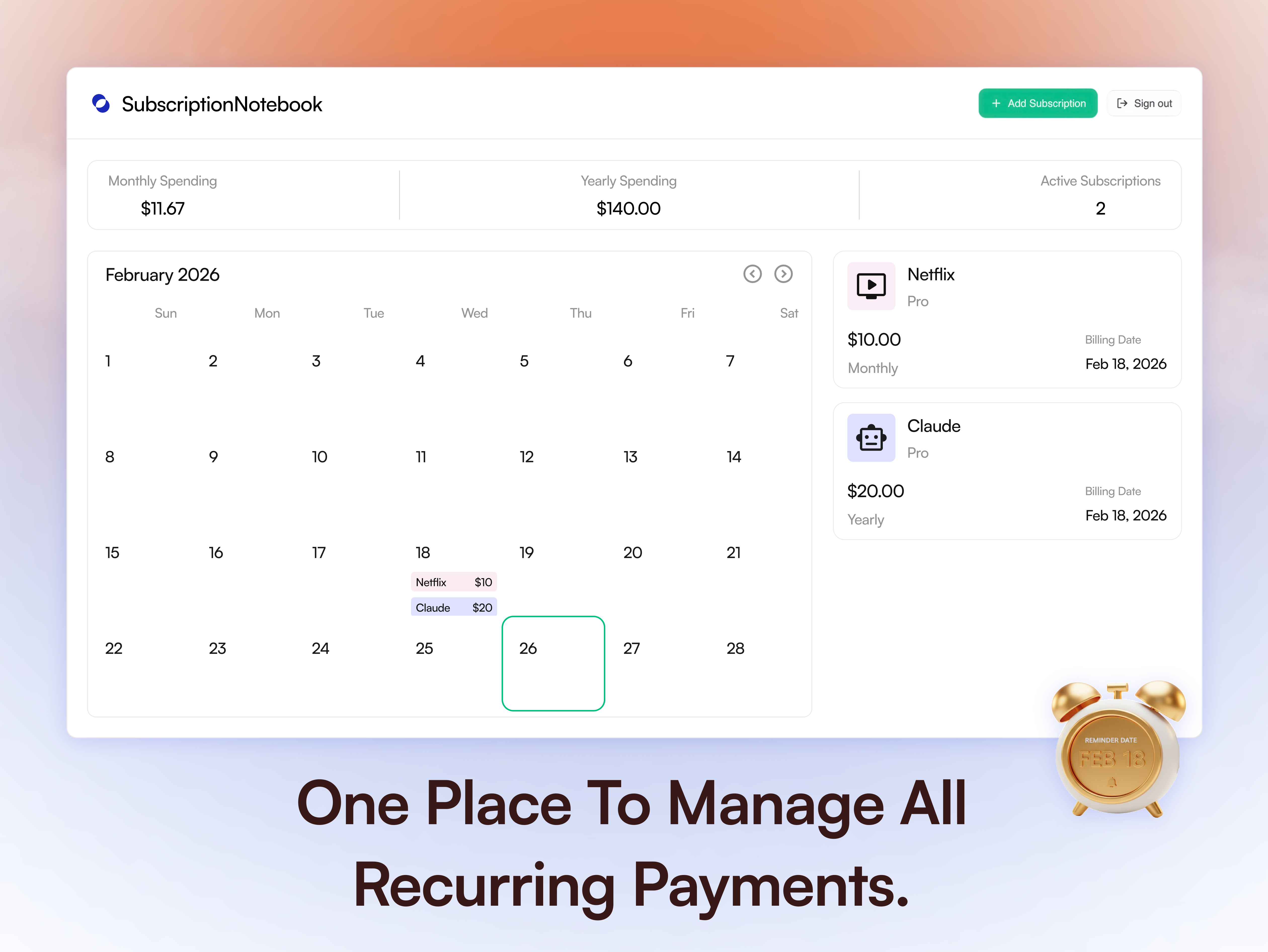 Track, manage, and cancel every recurring charge — never overpay for a subscription again.